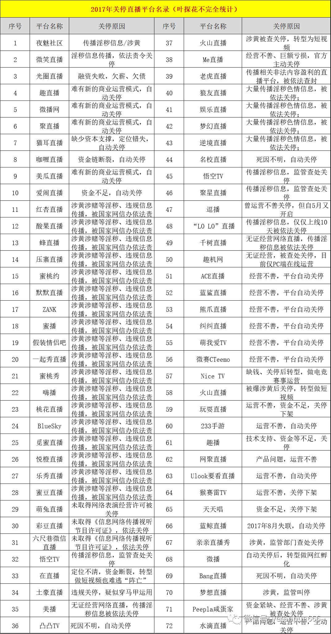 基于国家文化部、网信办、“扫黄打非”执法大队以及网络公开信息,叶探花不完全统计,2017年关停的直播平台累计72家。造成直播平台“死亡”的原因主要包括:试图打监管擦边球,触碰法律底线,涉黄违规;产品定位、市场运营、技术、资本难续等经营问题。