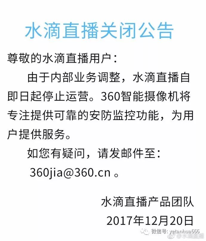 11月的一篇《一位92年女生致周鸿祎:别再盯着我们看了》将争议推向年内的最高点。此事引来360董事长周鸿祎和他团队的全力回应,并斥责对方为“黑公关”。但到12月20日,360水滴直播产品团队发出公告,因产品技术有限,宣布水滴直播即日起停止运营。
