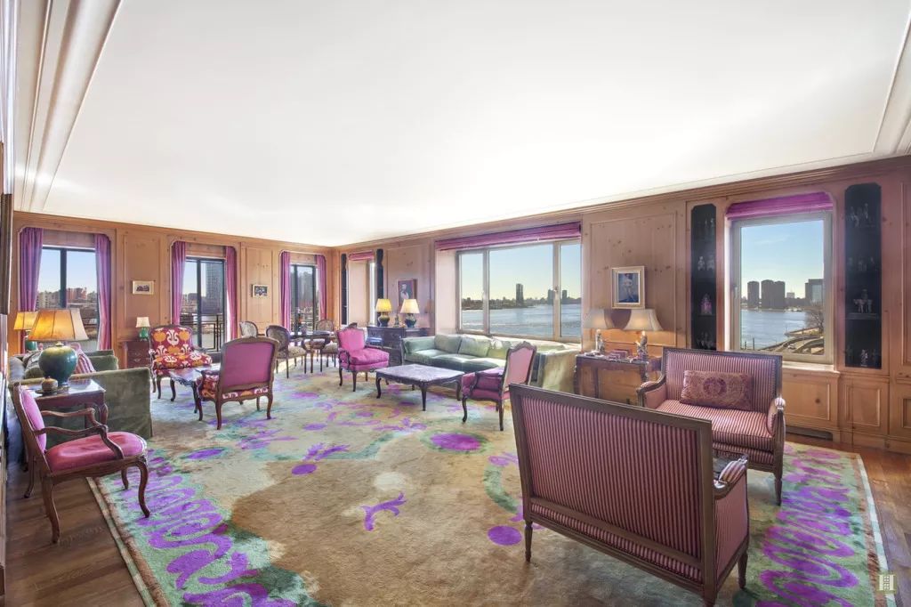 这间公寓还设有一部私人电梯,电梯门厅通向画廊的入口,一个宽敞的的 L形客厅,附带壁炉的独立阅读区,摆放着葛丽泰·嘉宝的艺术藏品,其他还包括:敞亮的落地窗、私人阳台、书房和一间宴会厅。