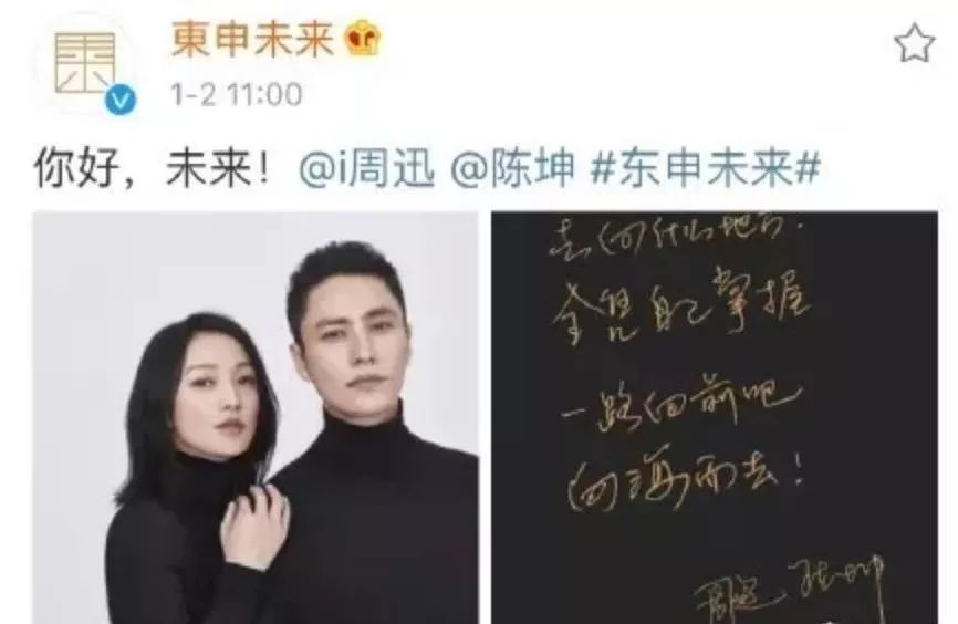 2018年伊始,陈坤和周迅公布了一个重磅消息——组团开了名叫“东申未来”的公司,“将会有演员的开发与经营、影视项目孵化、公益文化项目运营等”。