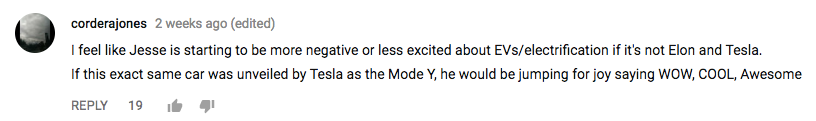 网友Corderajones说“我感觉Jesse对特斯拉以外的电动车都提不起兴趣,如果这辆ES 8是特斯拉发布的新车Model Y 的话,他肯定会大喊大叫起来,牛掰啊,不得了!!”