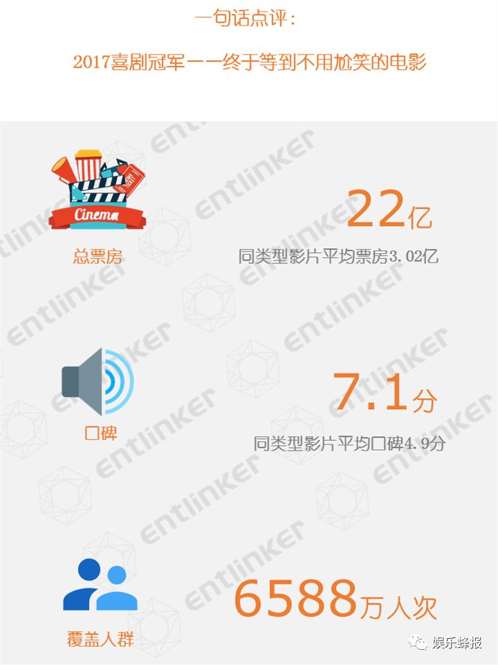 22亿票房居2017年国产电影票房亚军,开心麻花的高品质得到了观众认可。男女互换身体的老梗,开心麻花玩的恰当好处。团队很早之前说过,不单只是做喜剧效果,还希望作出更有意义的内容、情节。