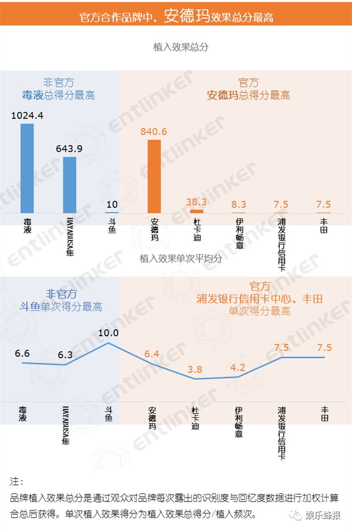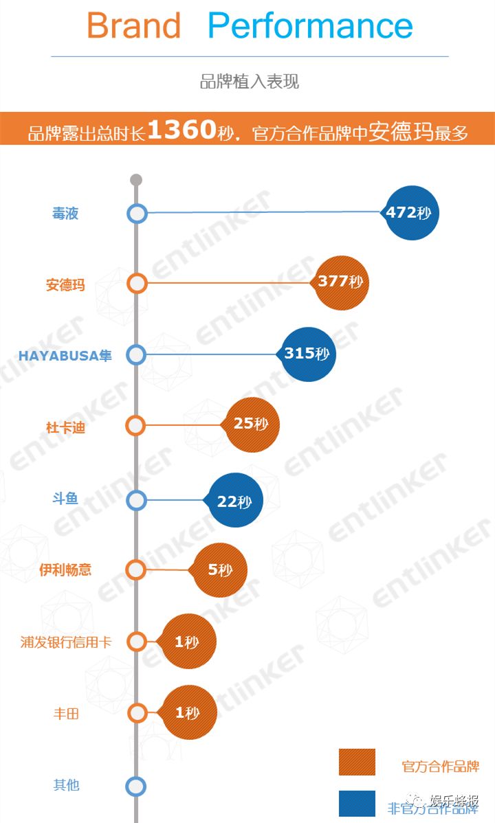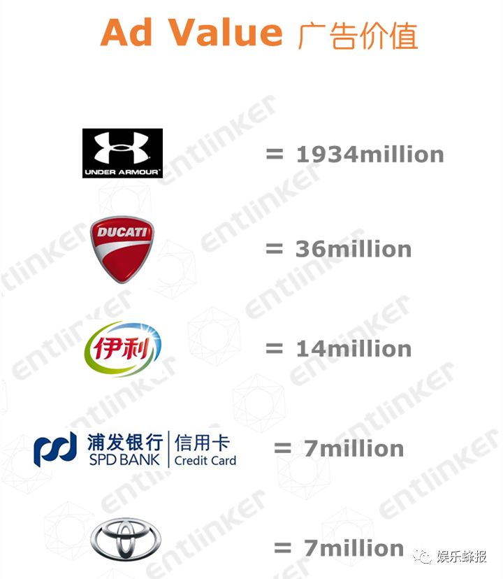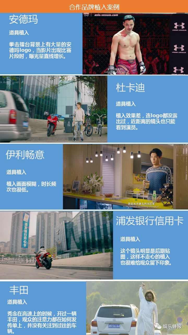 美国体育运动品牌UA安德玛近几年在国内越来越收到体育爱好者的追捧,此次在电影中的植入也是5个官方合作品牌中广告价值、植入权益、植入效果总分最高的。
