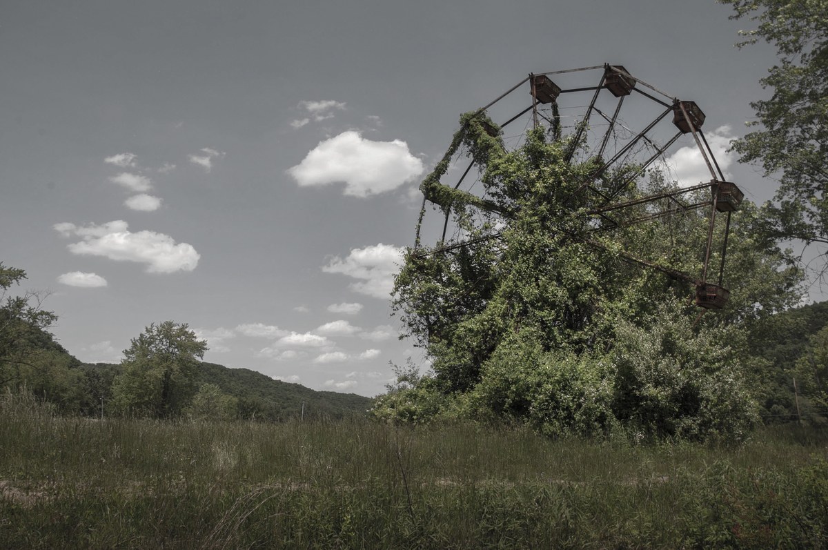 另外,劳利斯还发现,溜进大部分废弃的游乐园并不算一件难事,但有些则要费些功夫。比如说,为了拍摄出一个令人毛骨悚然的绿野仙踪主题公园,特别是那条诡秘的黄色砖路,他爬上了北卡罗来纳州的榉木山。除此之外,为了令这些破败的游乐园变得更加阴暗诡异,大部分照片都特意选在暴风雨来临前后拍摄。不仅如此,偶尔他还需要处理一些法律问题。例如,他曾在佛罗里达州拍摄了荒废的迪士尼河村水上公园,照片在网上发布后,迪士尼警告要起诉他侵权(但天马出版社还是采用了这些图片)。