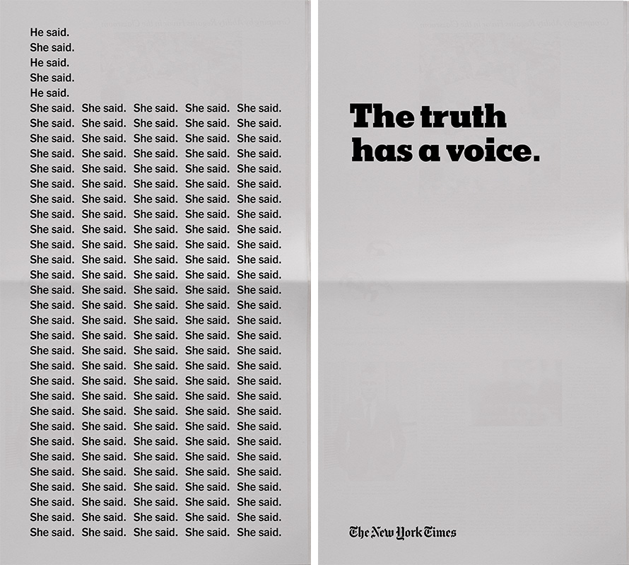 媒体对这场社会变革的关注还在持续。在刚刚过去的金球奖颁奖礼上,《纽约时报》做了一个不同寻常的30秒广告“The truth has a voice(真相有声)”。广告中没有任何复杂的元素,白底黑字显得简洁有力:“他说,她说,他说,她说,她说,她说,她说,她说……”最后以 “真相有力量。真相不会被威胁。真相有声。”结尾。