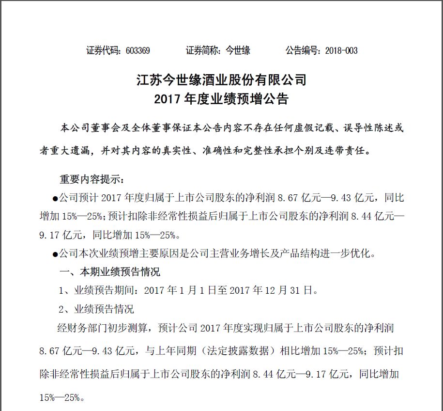 1月8日,今世缘在上交所发布了2017年度业绩预增公告,预计2017年度归属于上市公司股东的净利润8.67亿元—9.43亿元,同比增加15%—25%;预计扣除非经常性损益后归属于上市公司股东的净利润8.44亿元—9.17亿元,同比增加15%—25%。