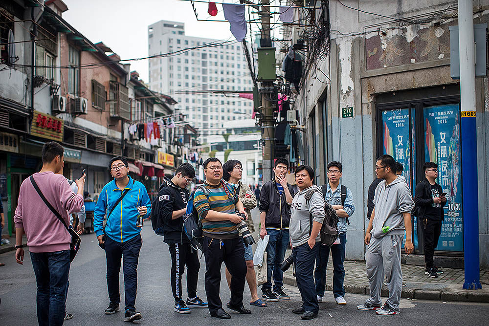 更多时候,近距离见到偶像的机会,都发生在SNH48星梦剧院,这里是连接偶像和粉丝的大本营。图为一群男粉丝在SNH48星梦剧院门口等待,他们有各自的工作、学业和生活,因为兴趣相投组成应援团,支持自己喜欢的成员。粉丝们在这里见证了SNH48成员从平民少女到青春偶像的华丽蜕变。其中一位粉丝谢先生25岁,是上海一家公司的职员,喜欢李钊两年了,“我觉得桃宝宝(注:粉丝对李钊的昵称)很暖,很有正能量,就算不开心也不会表现在舞台上,能带给我们快乐。”