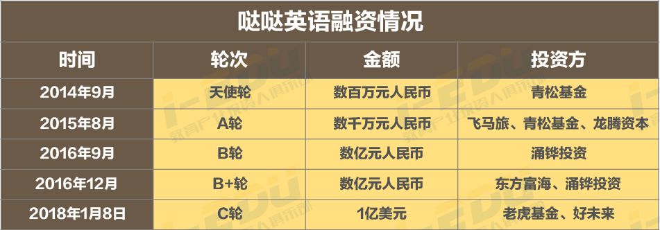 哒哒英语主营在线少儿英语培训,在此之前曾获得东方富海、涌铧投资的 B+轮融资,涌铧投资的数亿元 B 轮融资,龙腾资本、飞马基金的 A 轮融资,以及青松基金的天使轮融资。本次融资后,公司将加大在教学产品和技术的投入,打造真正的在线学校。