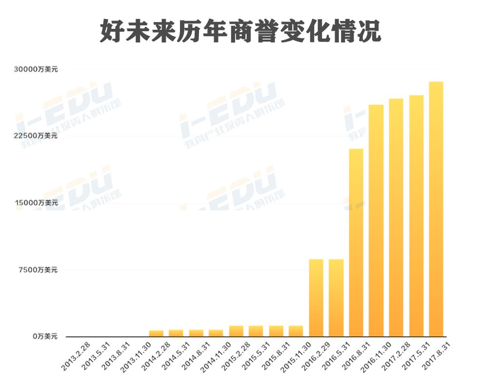 这一点也在好未来财报里得到了佐证,其中商誉一项,从2013年的55万美元,增长到2015年的1230万美元,再而跃升至2017年8月的2.86亿美元。