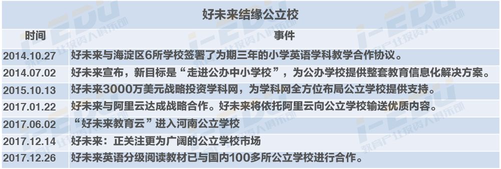 去年8月,好未来调整公司架构,把“与公立院校合作”作为公司的五大事业群之一。事实上,早在2014年,好未来就制定了“走进公办中小学校”的战略目标,自此好未来步入与公立学校合作的轨迹。先是推出“互动课堂项目”,为公立学校提供整套教育信息化的解决方案。之后,与海淀区6家小学签订合作协议。2016年,好未来引入英语分级阅读,目前已与国内100多所公立学校进行了合作。