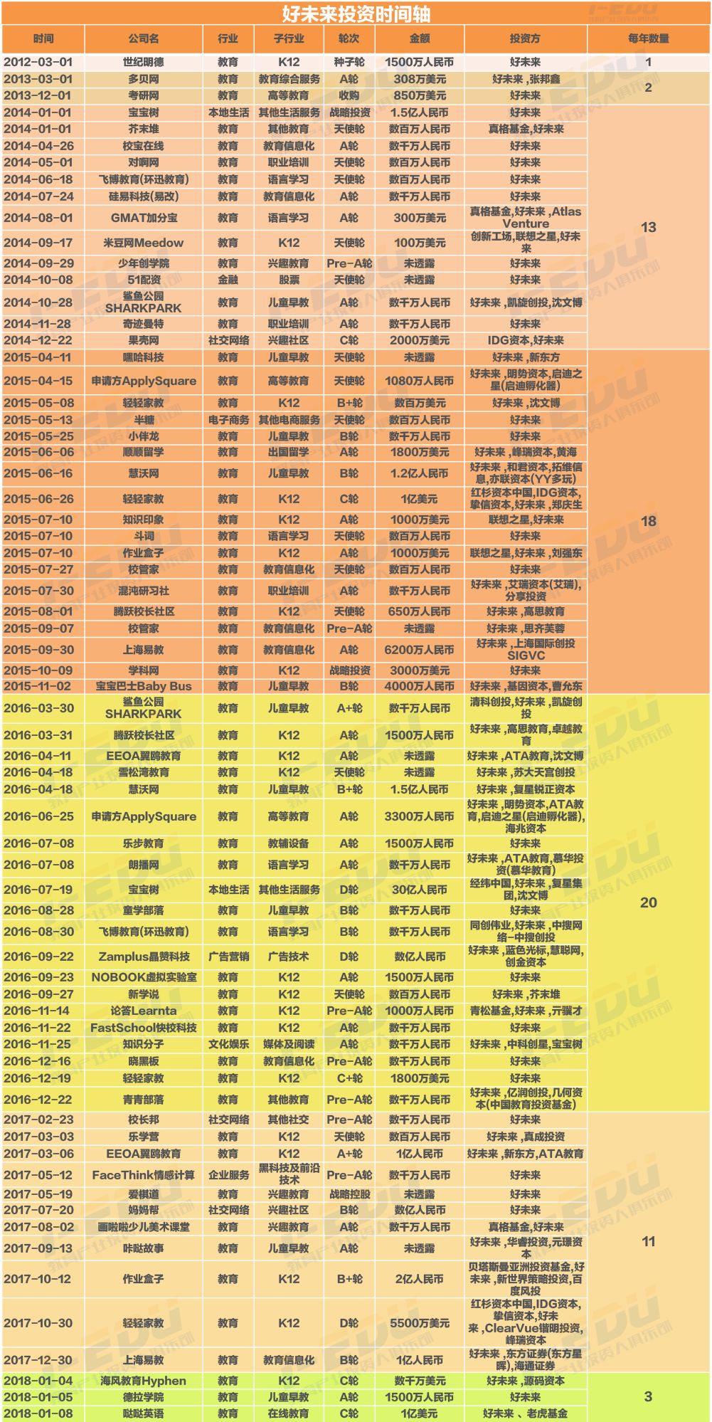 从年份上看,2016年好未来投资了20家企业,平均一个月一家半的节奏,脚步确实不慢。但是,其中7家是重复之前投过的标的。好未来所有投资案例中,反复投资的一共有11家公司,而在2016-2017年,新标的减少,注重投后管理和反复投资成为了新的特征,其中好未来对轻轻家教更是3年投了4次,从B+一直追到D轮,可见对其情有独钟。
