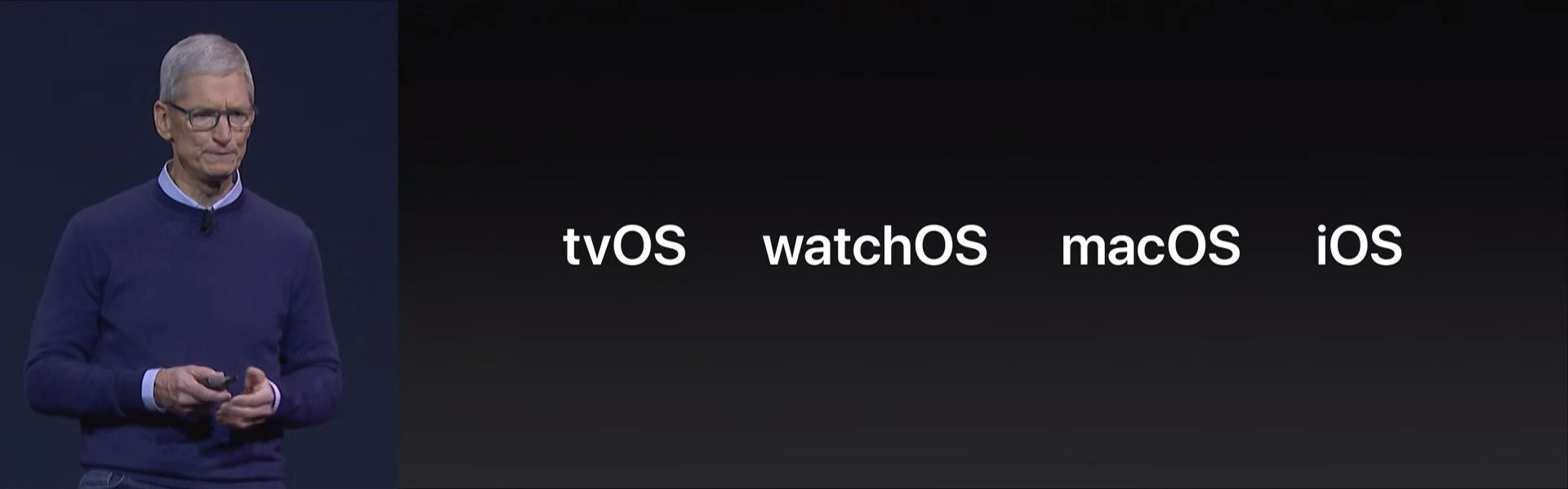 开场时,苹果 CEO 库克便以 tvOS 入题,从 Keynote 上四大操作系统的排列来看,足以见得苹果对 Apple TV、tvOS 以及整个内容生态的重视程度;