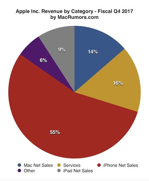 几年前就假设说如果将 iPhone 单独拿出来成立一家公司,其营收都超过了微软、谷歌、亚马逊。而在苹果 2017 年第四季度的财报里,就 iPhone 一项就占主营的 54.86%,而软件及服务加起来才 16.17%。