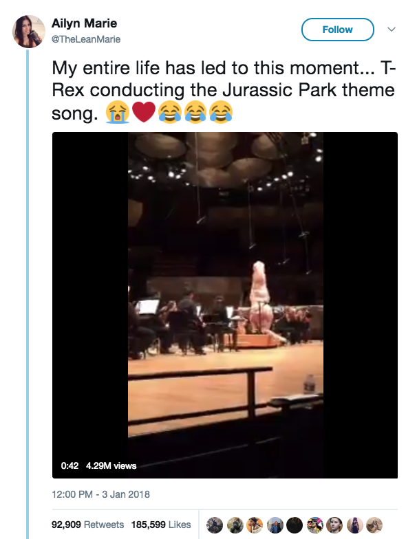 人活着就是为了这一刻……霸王龙在指挥侏罗纪公园的主题曲。