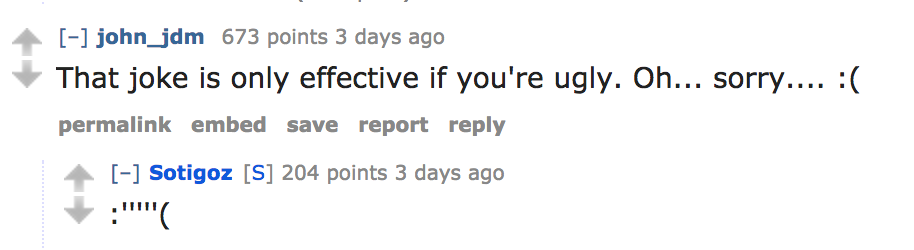 网友:这是一个只有在你长得丑的情况下才有效果的笑话。哦……不好意思哦……: (