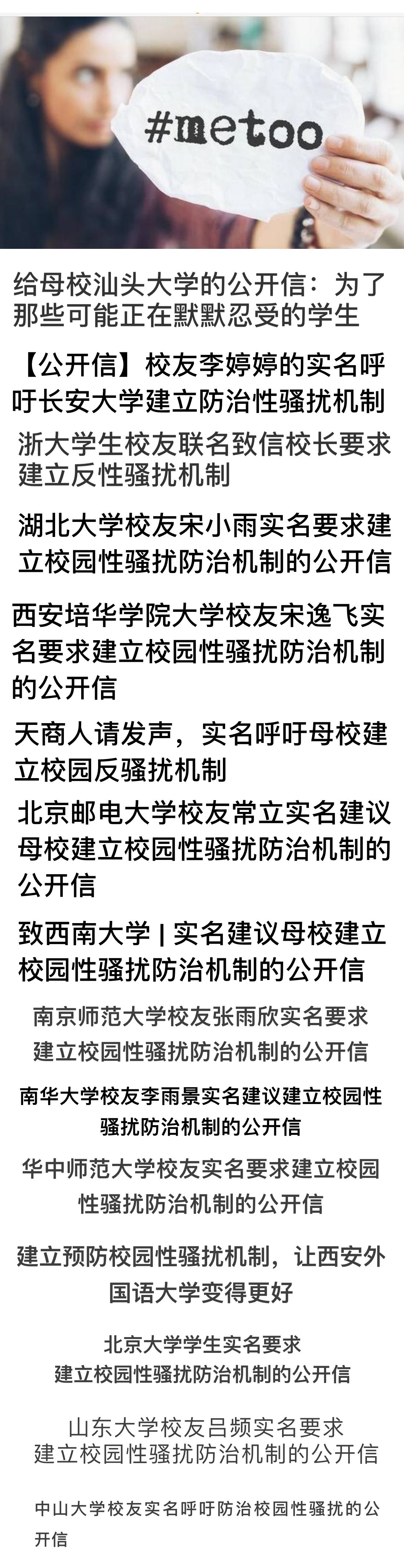 各高校校友实名呼吁学校制定防治校园性骚扰政策,