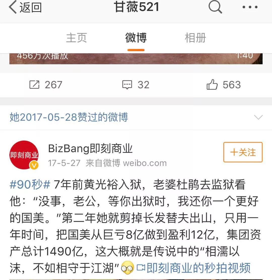 甘薇点赞的那条微博,是一条关于杜鹃的粗糙的用PPT连起的短视频,说“杜鹃做财务出身,英文流利;她出山把反派赶出董事会;她想把国美做成腾讯+阿里+沃尔玛;她说自己不想当企业家,等黄光裕出狱了,她就能做一点自己喜欢的事;她要给黄光裕一个更好的国美”。