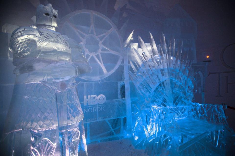 今年的主题是与HBO合作,邀请来自俄罗斯、波兰、拉脱维亚的冰雕艺术家们用了1个月时间搭起了一个《权力的游戏》冰雪世界,连铁王座和异鬼都做出来了。一共是24间房间,室内温度保持在零下2-5摄氏度之间,包括14间标准间,10间套房,房间里该有的设施都有,还多了一个御寒睡袋。因为是冰雕而成,房间里的摆设和布局比起日常酒店更复杂,而且灯光在这里起的作用和彩漆是一样的,不同颜色的灯光能营造出完全不同的意境。比如这间异鬼房,造型完全参照电视剧中的形象,全身没有灯光。只给眼睛安装了蓝色的灯泡,就足以让这个角色活灵活现了,只是,在异鬼的注视下入眠是有点恐怖了。