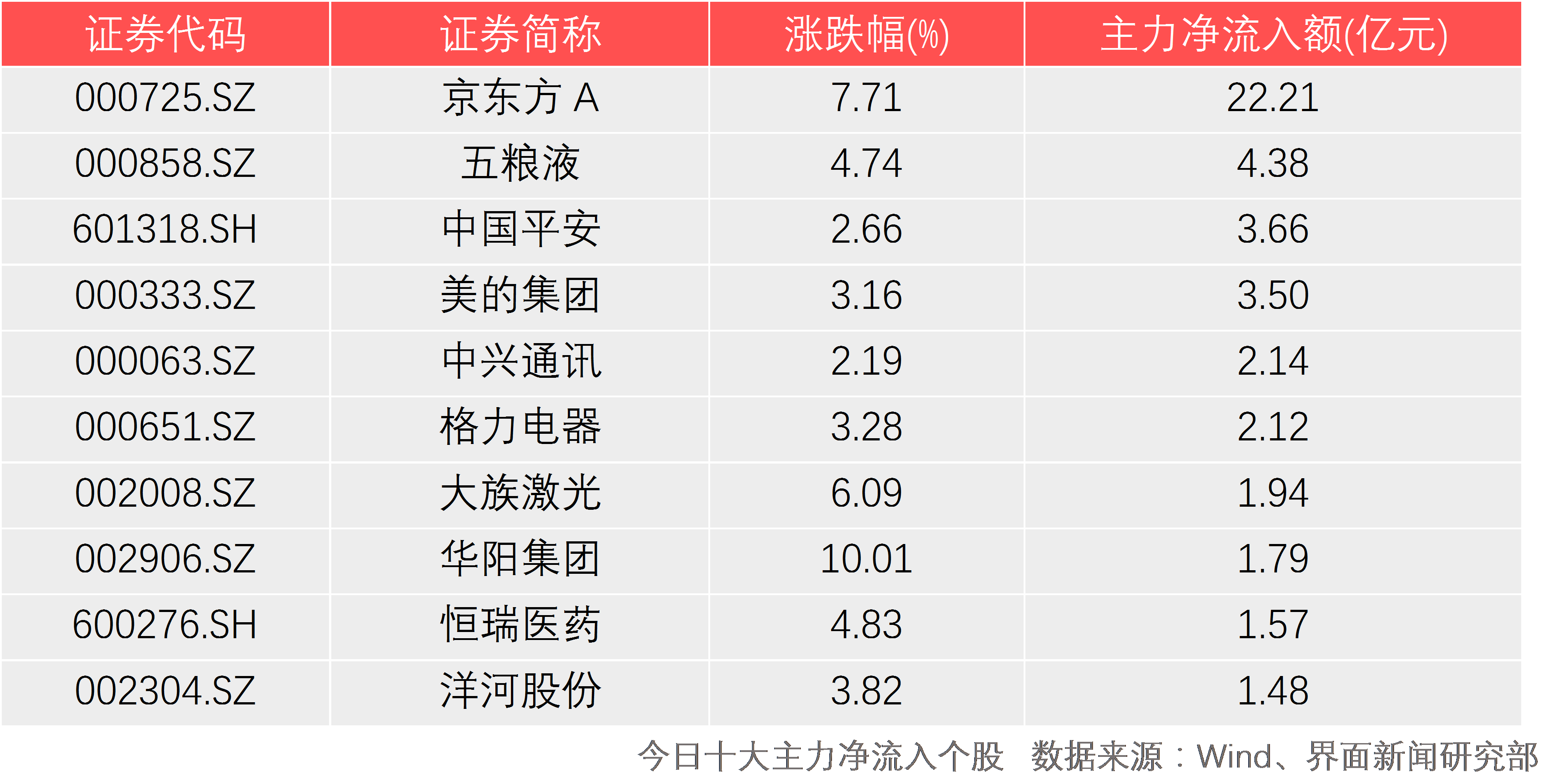 从个股表现上来看,今日主力资金净流入排名前三的是京东方A(000725.SZ)、五粮液(000858.SZ)、中国平安(601318.SH),分别净流入22.21亿元、4.38亿元、3.66亿元。除次新股华阳集团(002906.SZ),其余9只个股均为行业龙头股。京东方A在遭遇连续三个交易日的主力资金流出后,迎来了今日的热捧,主力资金净流入额远超其余个股。白马股也占据了半壁江山,除五粮液和中国平安外,美的集团(000333.SZ)、格力电器(000651.SZ)、洋河股份(002304.SZ)的主力净流入额分别为3.50亿元、2.12亿元、1.48亿元。