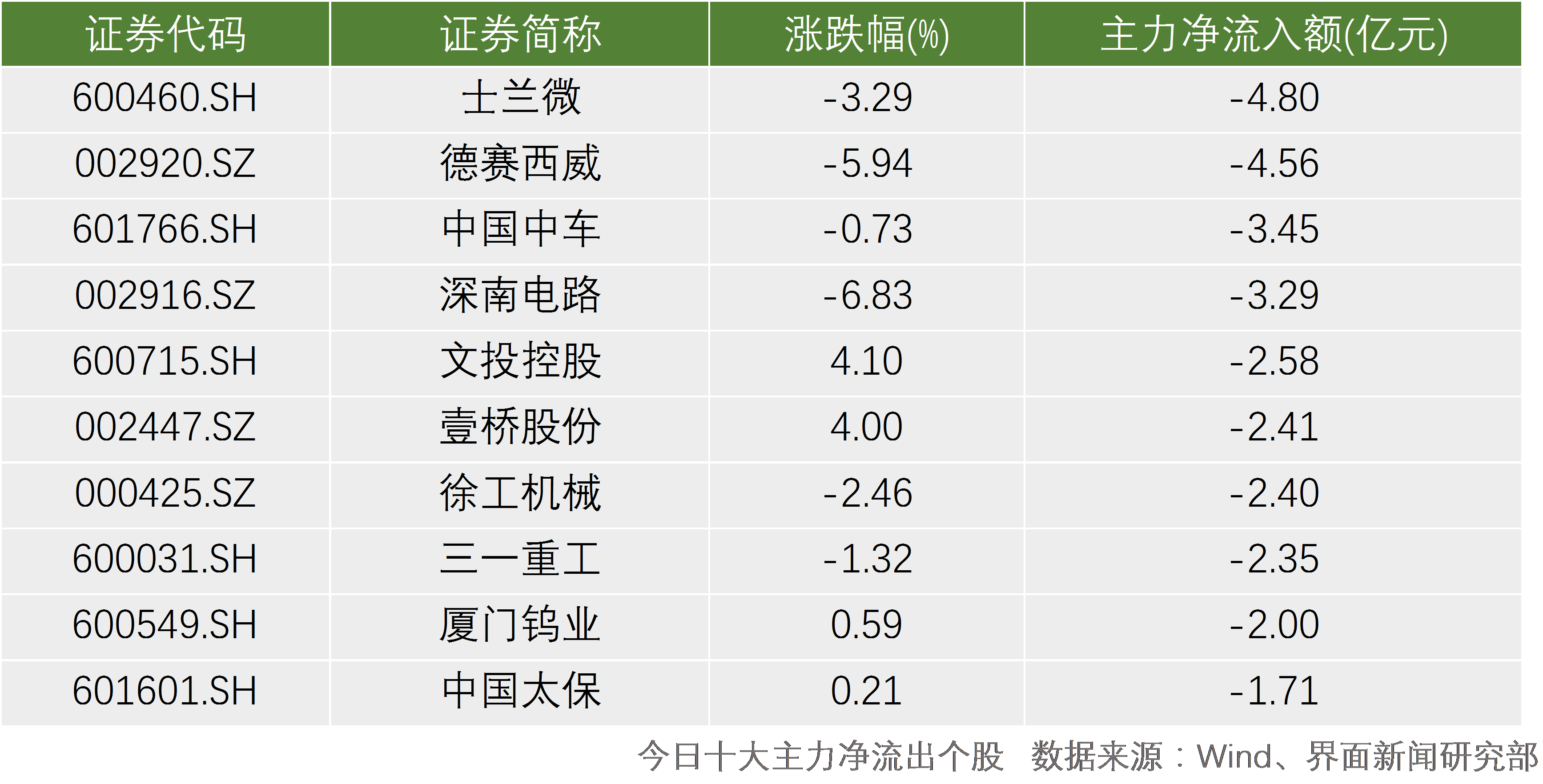 士兰微(600460.SH)、德赛西威(002920.SZ)、中国中车(601766.SH)成为主力资金今日重点抛售对象,分别净流出4.80亿元、4.56亿元、3.45亿元。在主力资金撤出排名前十的个股中,除德赛西威、壹桥股份(002447.SZ)、中国太保(601601.SH),其余7只个股均为预增概念股。