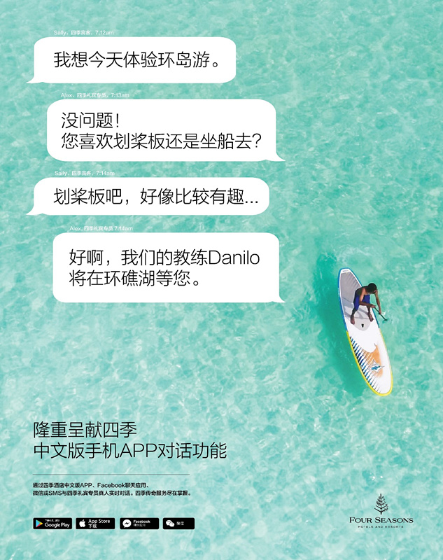 2017年第四季度,四季酒店集团上线了最新的移动端聊天功能,客人们只用拿起手机打字,就可以像和亲朋好友聊天一般,以短消息来往的形式跟酒店工作人员保持实时沟通联络。目前用四季酒店官方APP、Facebook Messenger聊天应用、微信和短信中的任何一种方式,客人就可以咨询酒店信息、告知入住需求喜好、管理餐饮娱乐预定、呼叫客房服务、进行离店后沟通联络等多项功能,而且如果客人外语不好,官方APP还能针对包含中文在内的100多种进行实时互译,解决沟通中的障碍。