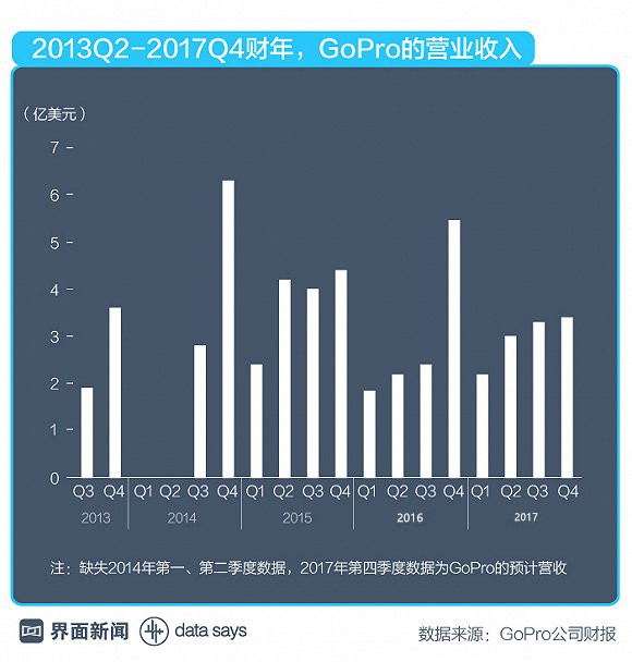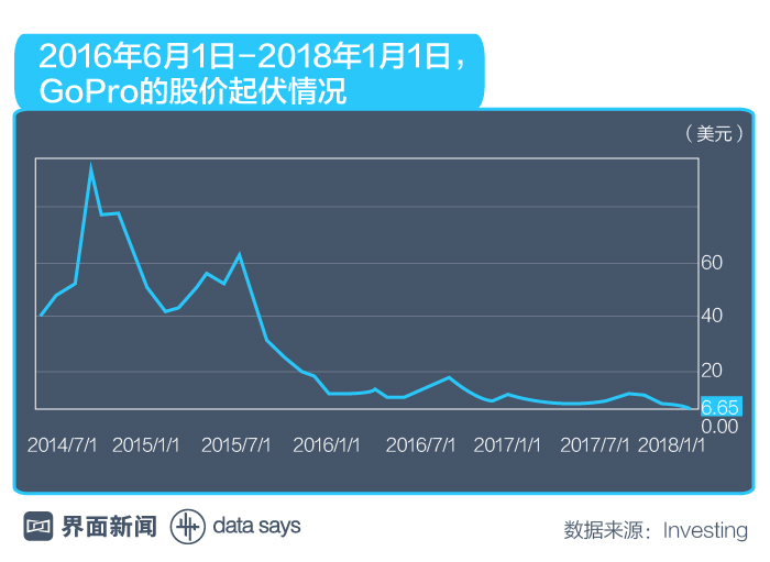 GoPro由尼克·伍德曼创立于2004年,2014年首次公开募股,筹资4.272亿美元,于纳斯达克上市。回首十余年历程,GoPro发展速度惊人,2014年股值达到顶峰,每股86美元,且2014年第四次季度的营业收入也为历史最高,达6.3亿美元。