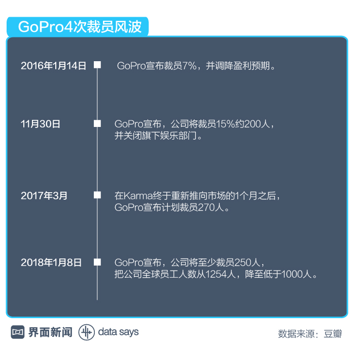 就在此前一天,GoPro还公布下调第四季度营收预期,并将退出无人机市场。此外,证实了裁员传闻,宣布至少裁员250人。