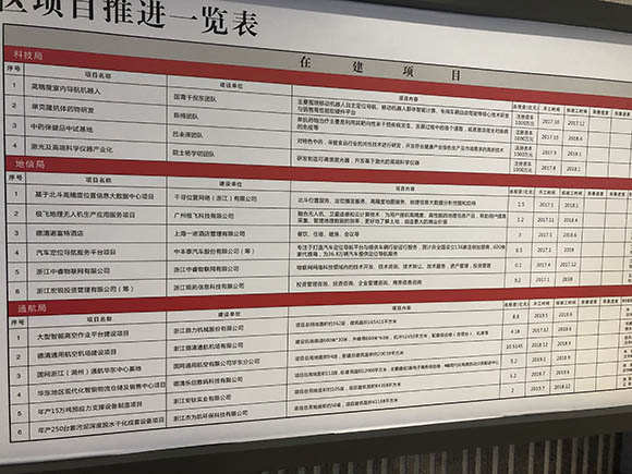 在德清高新区管委会楼下,有一整面墙都是德清高新区官网项目的进展图——其中包括北斗高精度地理位置大数据中心项目、机飞无人机项目等共计百余项。具体涵盖项目名称、建设单位、项目内容、投资额、开工竣工时间等。