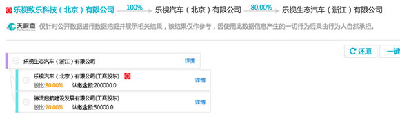 就乐视生态汽车(浙江)有限公司的股权结构来看,浙江当地企业德清启航建设发展有限公司占股20%,其余还是归乐视汽车北京公司所有。德清启航负责德清辖区内村镇基础设施、公用设施及工业、商贸用房的建设和经营,土地开发和综合利用。