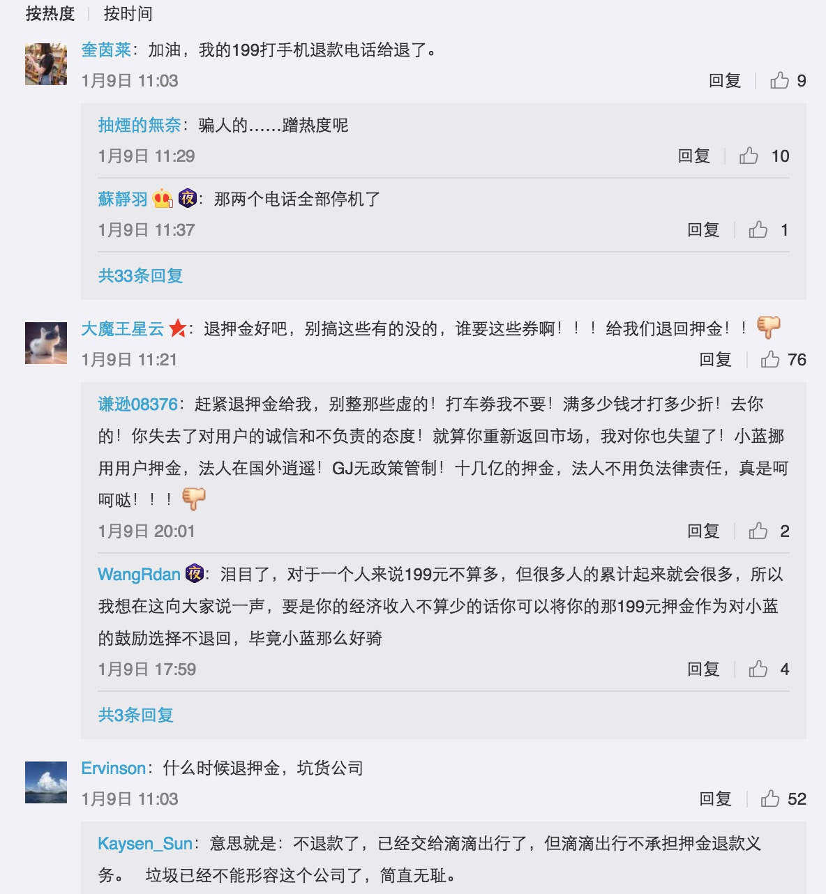 小蓝在微博发出的和滴滴的托管交易声明下面,全是用户的吐槽。