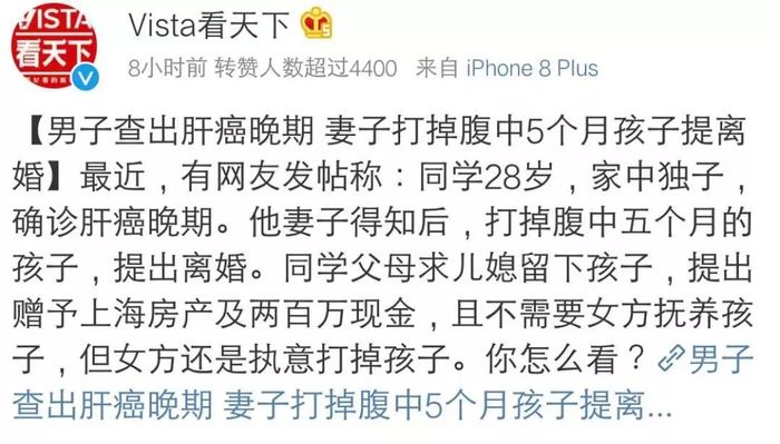 某网友爆料称,自己的朋友被确诊为肝癌晚期,他的妻子得知这一消息后,提出离婚,并打掉了肚子里已经5个月的孩子。