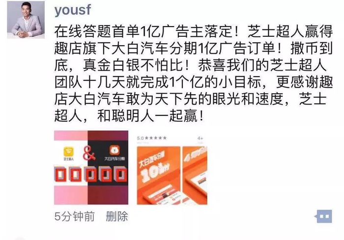 与此同时,映客创始人兼CEO奉佑生在朋友圈宣布,“芝士超人”获得趣店旗下的大白汽车分期1亿元赞助。“撒币到底,真金白银不怕比!”言语之间是毫不隐藏的激动。