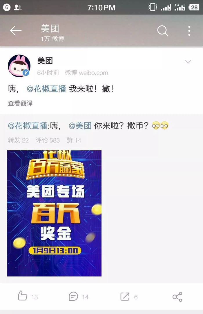 美团与花椒直播官微互动调侃