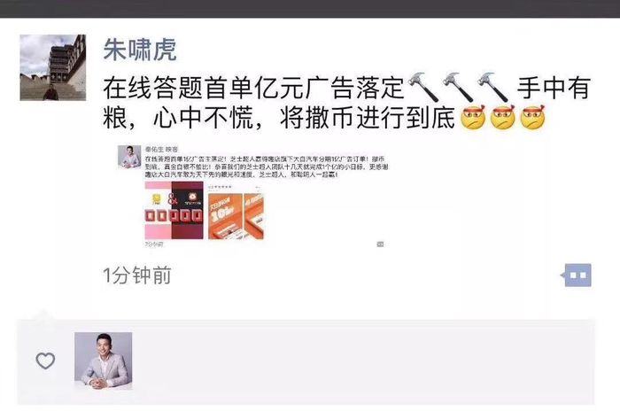 映客创始人兼CEO奉佑生发布朋友圈,宣告拿下首单广告。