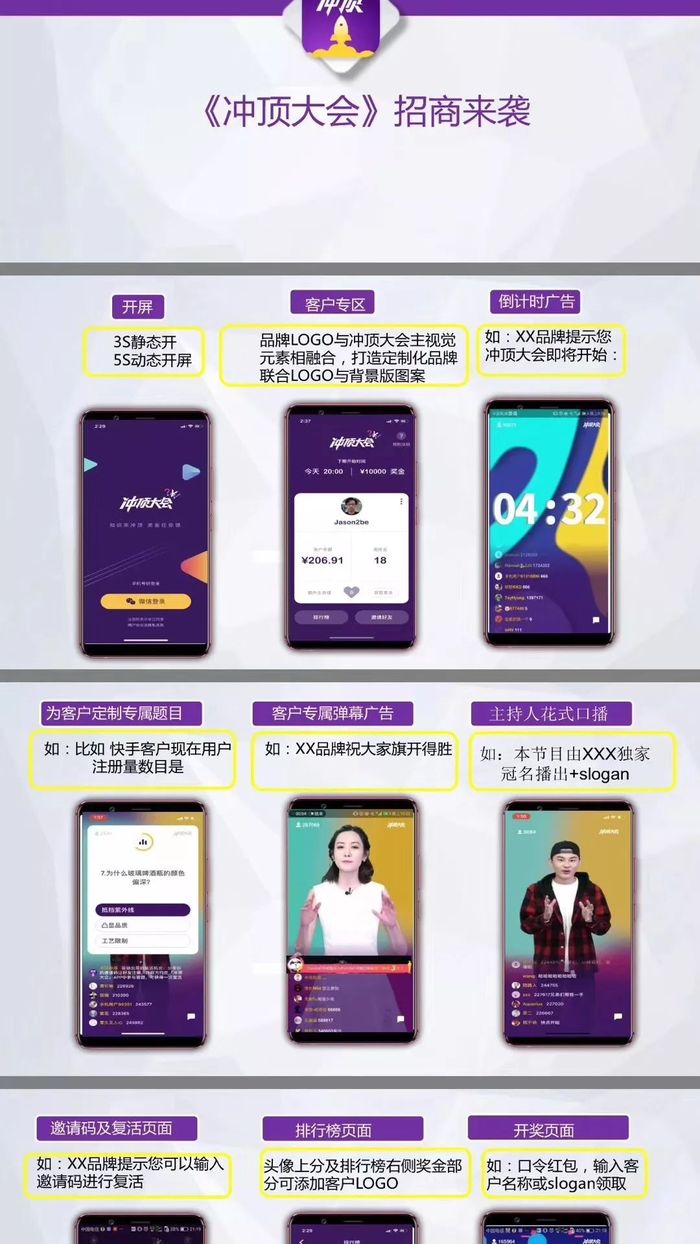 而王思聪力挺的“冲顶大会”也流出招商海报。海报中提供了开屏、倒计时广告、定制题目、弹幕广告、口播广告等多种方案。
