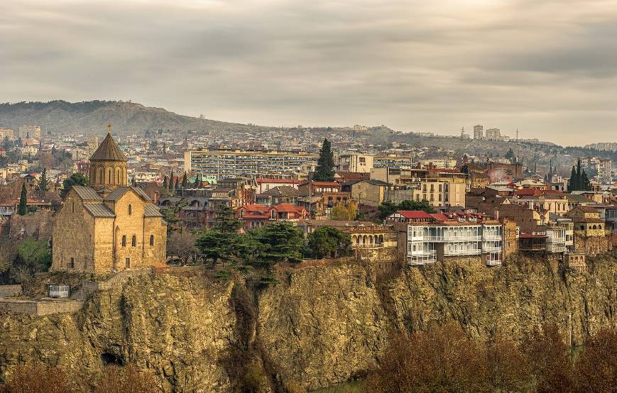 第比利斯依山而建,其中最佳的观景地点还要数Nariqala要塞。始建于公元4世纪的Nariqala要塞,历来是保卫第比利斯的最后一道防线。第比利斯老城Metekhi桥头开始步行上山,也可在老城河对岸坐缆车,单程1GEL,往返2GEL。行至最高处,有一个巨大的十字架,远眺可以看见“格鲁吉亚母亲”塑像和和平桥,继续前行下山便可返回自由广场,第比利斯具有特色的硫磺浴场也在附近。