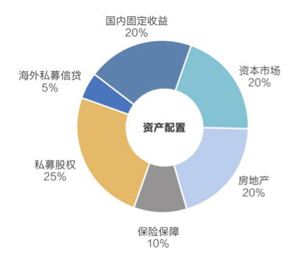 以1亿元资产为例,宜信财富建议投资者将25%的资产配置到私募股权、20%配置到房地产、20%配置到国内固定收益、20%配置到资本市场、5%配置到海外私募信贷、10%配置到保险。