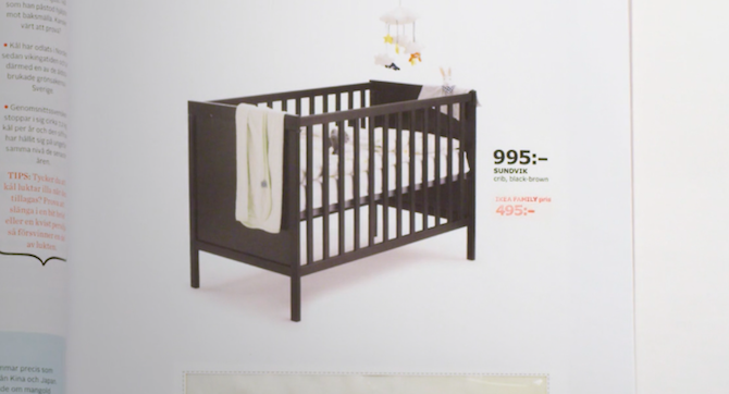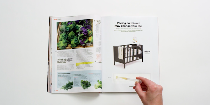 这句让人满脑问号的广告语来自宜家,而这句广告语也的确是真的。宜家最近在瑞典女性杂志Amelia投放的杂志内页,看起来只是普通的婴儿床促销广告——其实它是一整张验孕试纸。