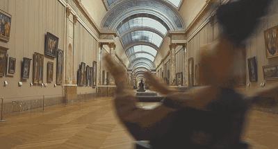 他推着瓦尔达跑着穿越整个卢浮宫,顺带致敬了戈达尔的黑白片《法外之徒》。