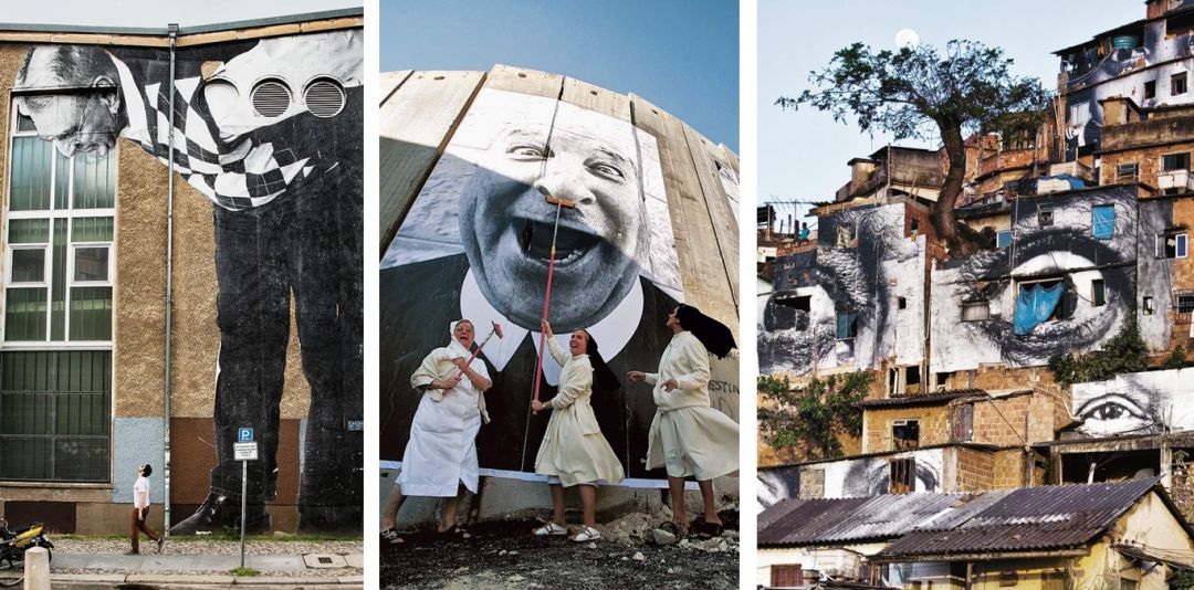 ▲ 自上而下、从左到右:JR在巴黎、柏林、巴勒斯坦、里约热内卢创作的作品