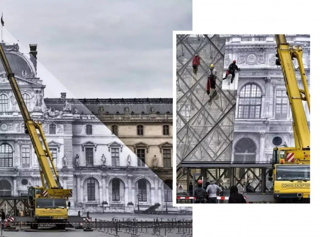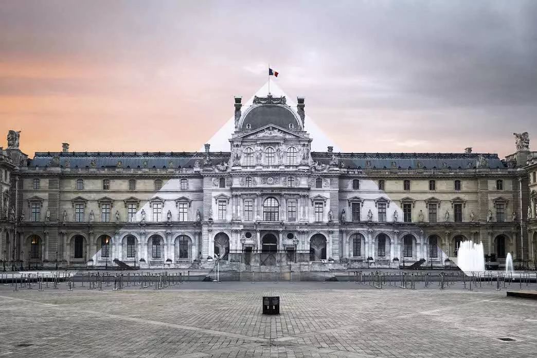 2016年,JR在巴黎卢浮宫金字塔前大玩了一把障眼法,他将一幅16世纪的卢浮宫黑白照片,完美地覆盖在金字塔的700多片玻璃外墙上,让经过的游客产生视觉陷阱——庞大的建筑居然凭空“消失”了。
