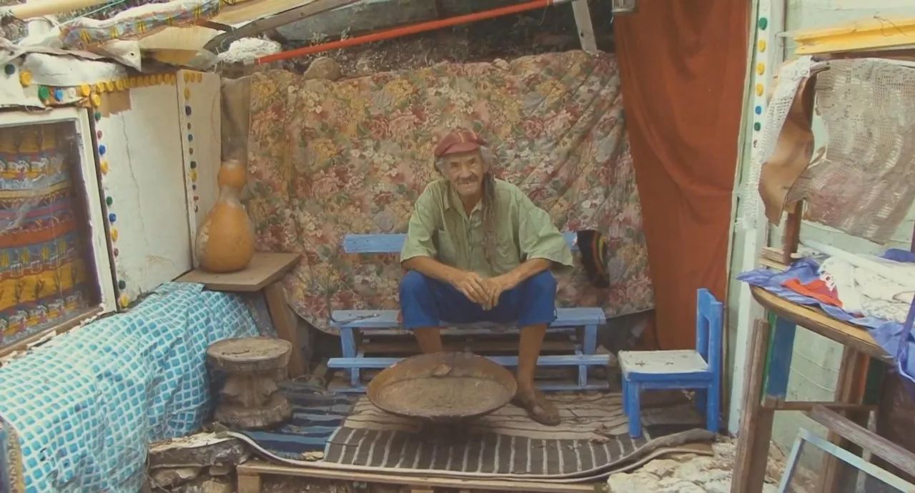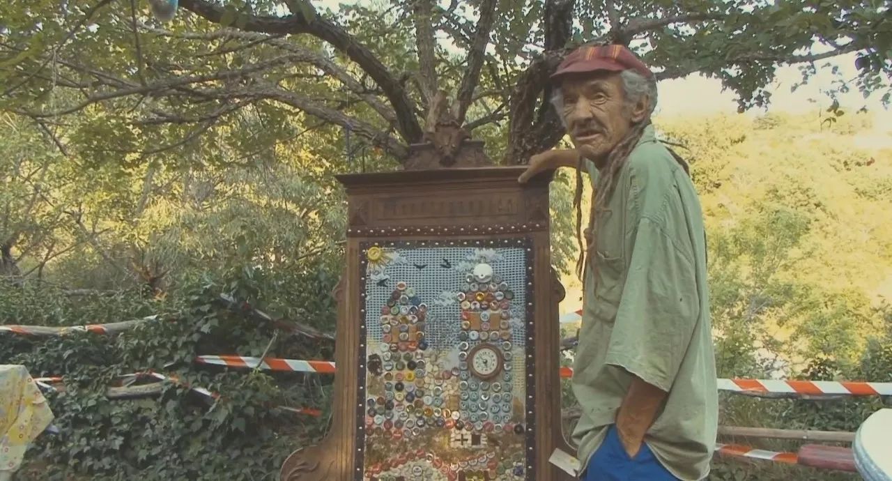 但他同时也是一个乐观的艺术家,用捡来的瓶盖作画,用铁板来制作风铃,用别人不要的小家具来打造自己的花花世界。