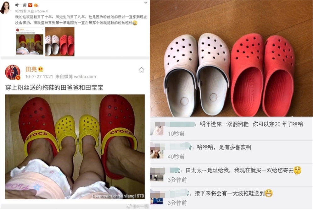近日,明星叶一茜在微博晒出了家里的两双“老龄拖鞋”,引发了粉丝围观。她发微博称:“我的这双拖鞋穿了十年,田先生的穿了八年。他是因为粉丝送的所以一直穿到现在没舍得扔,而我坚持穿到第十年是因为一直在等那个送我拖鞋的粉丝粗线”。