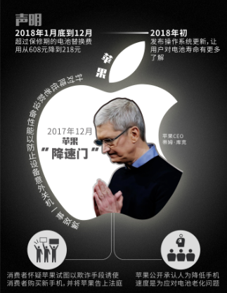 苹果在《说明》中表示:“Apple将更换过了保修期电池的价格降低了人民币390元,从人民币608元降到人民币218元。此举针对使用iPhone 6及后续机型的需要更换电池的用户,在全球范围内持续到2018年12月”。
