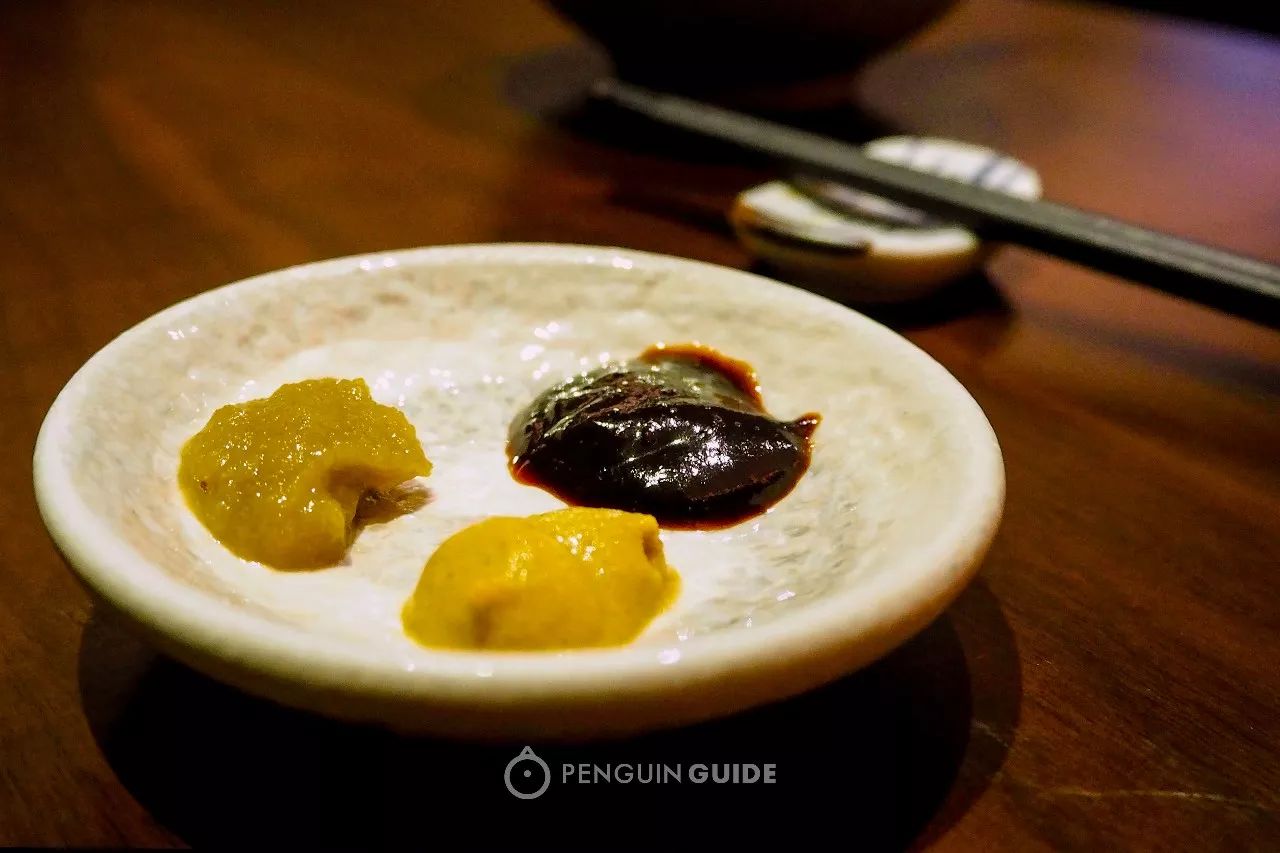 蘸料给了三种:黄芥末、柚子胡椒和田乐味噌,柚子胡椒是亮点,清新中带着辛辣,但吃到最后发现三种打混了一起蘸,也很不错。