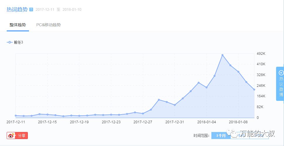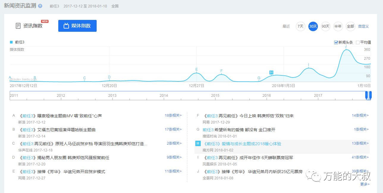 最后,终于到了正题,相信这也是很多人的困惑。大叔曾经在多篇文章中提到过,以“百度指数”为核心的传统公关评价体系没有了,所以,如果你傻乎乎地希望从百度上得到一些什么线索,现在来看,是徒劳,因为百度里大部分都是其票房逆袭的新闻,根本看不出来《前任3》是怎么火的。那答案在哪儿?社交媒体。大叔主要分析微博和微信两个平台,尤其是微信指数,因为微信的日活用户有9亿。