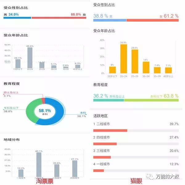 大叔认为,淘票票的用户数据逻辑有些问题,低龄但学历高,而猫眼的数据则是高龄学历低,大叔觉得,低龄学历低和高龄学历低或高,这三种数据组合才是比较合理的。因此,大叔比较更相信猫眼的数据。