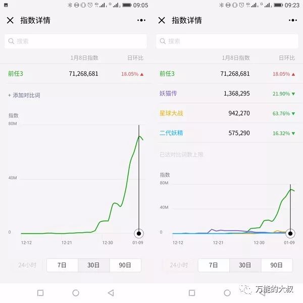 跑题了,回到上面的数据分析。经过三组数据的对比,大叔发现几个关键的传播时间截点:12月29日和30日(首映及第二天),1月2日和1月3日(元旦假期之后的两天),1月5日、6日和7日(元旦假期之后的第一个周末),1月8日(本周一)。