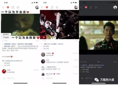 前面说了内容和话题,大叔聊聊推广的平台。短视频成为《前任3》推广非常重要的一种形式,简单粗暴,受年轻人喜欢,所以,快手、抖音、西瓜视频、秒拍等短视频平台,成为其主要内容源的生成平台,好的视频素材再由这些平台向微博和微信两个更大的社交平台扩散。当然,还有微信的很多剧情反转的截屏,也被大家乐此不疲地转发着。