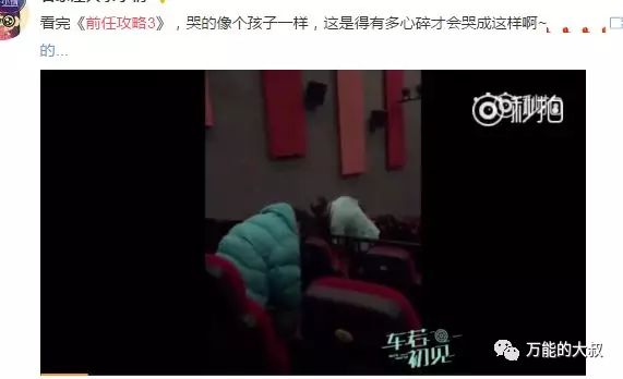 大叔发现,这样类似的视频比比皆是,成为《前任3》的最大吐槽点,并引发了新一轮的观影潮。大叔上周日在一个影院的门口就听到两位年轻的姑娘在对偶遇的朋友开玩笑地说:“刚看完《前任3》,我们就是要看看哪些个小婊子哭得稀里哗啦的”。